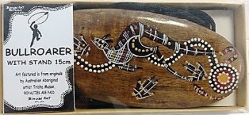 | The bullroarer, labelling and packaging conveyed the same impression as the boxed boomerangs. In addition, the Australian Aboriginal artist Trisha Mason is identified as the artist whose designs are used for the bullroarer, and to whom royalties are paid. | ![]() |