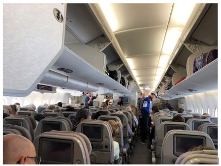Economy Class Cabin Emirates A380 during boarding. Observe that baggage falling from the overhead lockers will fall upon passengers sitting in the aisle seats (author's photo (c) copyright)