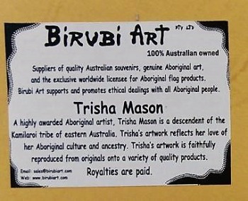 The message stones are not as recognisable Australian Aboriginal Cultural objects, did not convey the same impression, and the label simply states: “ABORIGINAL ART” and “HAND PAINTED”.